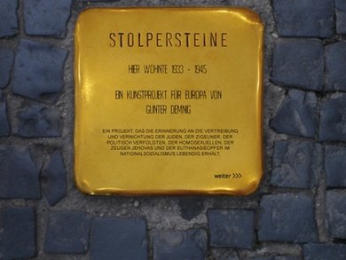 Der Künstler Gunter Demnig erinnert an die Opfer der NS-Zeit, indem er vor ihrem letzten selbstgewählten Wohnort Gedenktafeln aus Messing ins Trottoir einlässt. Inzwischen liegen STOLPERSTEINE in über 500 Orten Deutschlands und in mehreren Ländern Europas.